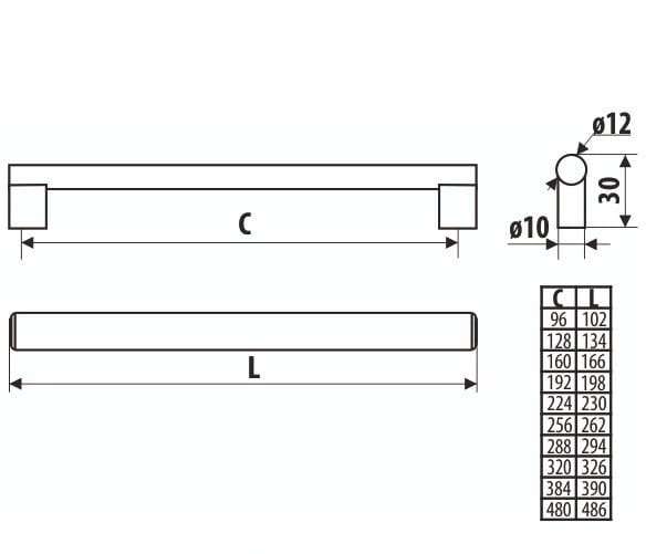 Uchwyt dostępny w następujących rozstawach : 96, 128, 160, 192, 224, 256,288, 320, 384, 416, 480, 576, 608, 694,704, 736 mm
